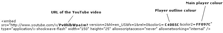 Okay, see the random string of numbers/letters/etc that's circled? (In this case, Pv0hlbWpa1w) Copy that and paste it into the YouTube player code, after "/v/". You don't need any other part of the URL, just the "Pv0hlbWpa1w" (or w/e) part.