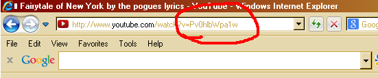 Okay right, the URL of the video. Basically, look up the video you want to embed on your profile (in a music player.. thingy wow I'm being extremely articulate today, aren't I), on YouTube. Note the url in the address bar: